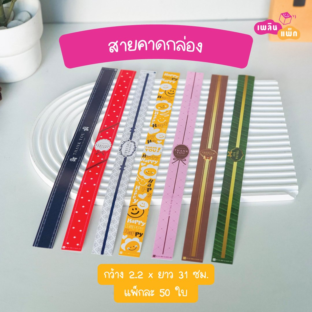 ขนาด: กว้าง 2.2 x ยาว 31 ซม. จำนวนต่อแพ็ก : 50 ใบ/แพ็ค สำหรับตกแต่ง คาดกล่องเบเกอรี่ กล่องของขวัญ กล่องอาหาร เพิ่มมูลค่าให้กับสินค้า